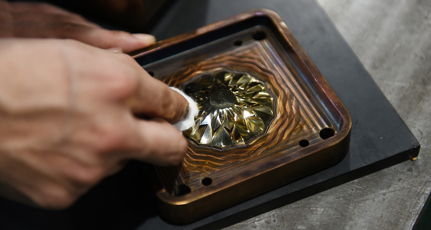 高い技術を持った職人が金型を手作業で鏡面に仕上げることにより、透明度の高いシリコングラスが成形することができます。